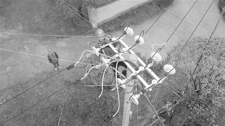 1月28日,天空中还飘着细雨。在万载县高城镇桥西村,国家电网万载县供电公司高城供电所的工作人员正在为该村新建变压器用户进行负荷割接。该公司组织21支党员服务队在各乡镇、村组大力开展电力线路设备特巡,上门帮百姓查漏补缺,维修检查电器电路,确保百姓用上安全电、舒心电,开心幸福过年。 本报记者 朱兆恺摄
