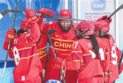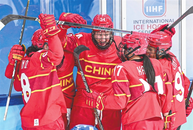 ▶2月3日,中国队运动员米勒(中)在进球后与队友庆祝得分。 当日,在五棵松体育中心举行的北京冬奥会女子冰球小组赛中,中国队以1∶3负于捷克队。新华社记者 王 菲摄