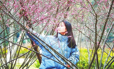 2月6日,乐平市洪皓森林公园内的红梅花成片绽放,吸引了许多市民前来观赏游玩,感受春天的气息。本报记者 徐 铮摄