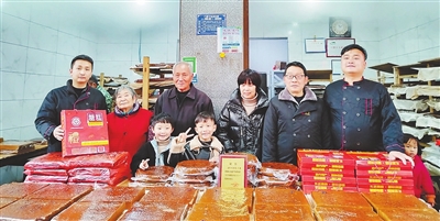 广丰廿四都糖糕制作技艺非遗项目传承人杨家勤(右二)四代同堂。 本报记者 余 燕摄