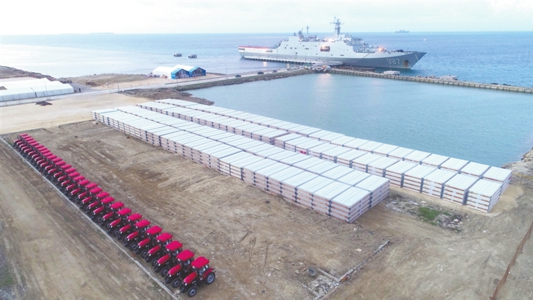 应汤加王国关于火山灾害救援的请求,由两栖船坞登陆舰五指山舰和综合补给舰查干湖舰组成的中国海军舰艇编队,于1月31日从广州出发,启运第二批中国援助汤加物资。这批运送的物资共计1400余吨,主要包括移动板房、拖拉机、发电机、水泵、净水器及应急食品、医疗防疫器材等。官兵经过137个小时轮班奋战,高效完成了物资卸载任务。