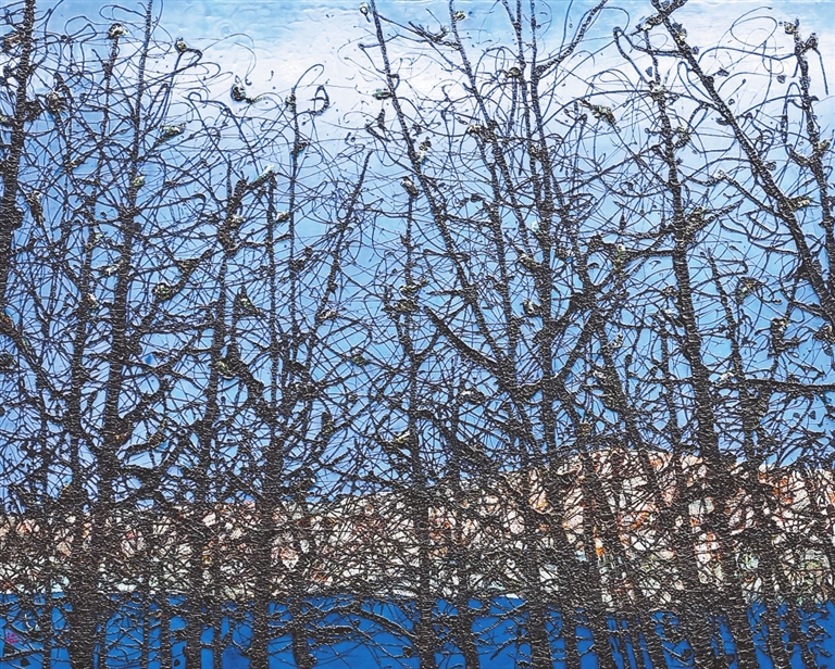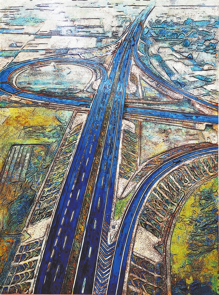 秦鹏的《昌九高速》(图①),以俯瞰视角,以纯度高的蓝色为基调描绘高速路枢纽,磅礴大气,富有视觉冲击力。支林的《雁过留声》(图②),同样以高纯度洁净的蓝色为天空背景,与画面主体——如蜘蛛网般的树枝,一简一繁,形成鲜明对比,杂乱的树枝也显得和谐。简净与繁密形成鲜明对比的,还有熊建新的《织网》(图③)和王燕、丁国强的《红土地》(图④)。此外,王喜梅的《醉花阴》,也给人印象深刻。画面主体洁白的丹顶鹤,肌理丰富,制作细腻,纷纷飘落的花瓣点缀其中,使画面动感十足,富有意境。