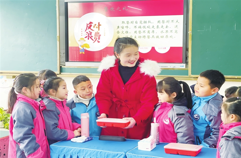 连日来,南昌市阳明学校开展“文明从我做起”活动,通过对“十礼”的展示和讲解,从坐、言、起、行等方面对学生进行文明礼仪教育,为南昌市“小手拉大手 文明齐步走”活动增添助力。图为指导学生餐饮之礼。(龚 娉)
