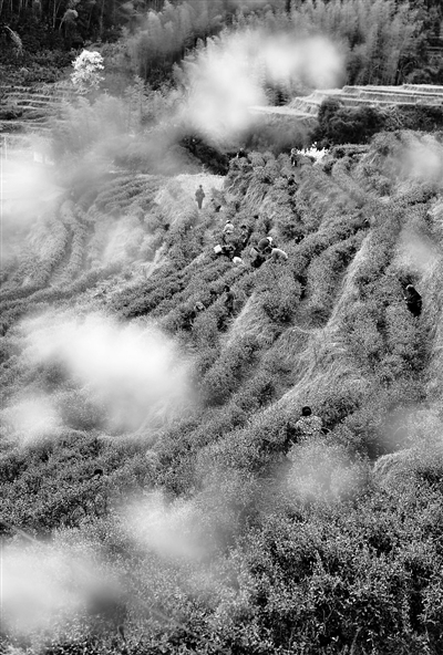 3月17日,采茶工人在万载县茭湖乡上峰村有机富硒生态茶园采摘“明前茶”。连日来,该村村民忙着采摘今年的春茶,供应各地市场。特约通讯员 邓龙华摄