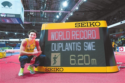 3月20日,瑞典选手杜普兰蒂斯在比赛后与成绩牌合影。