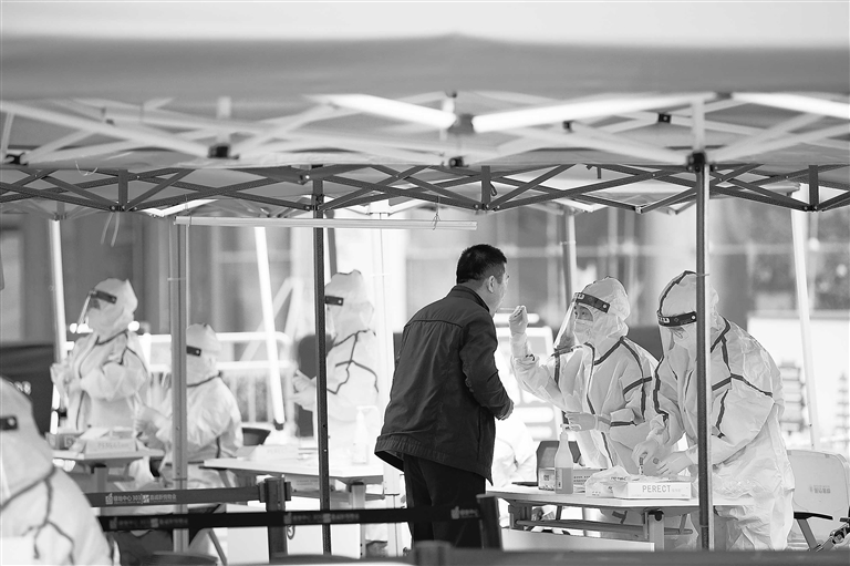 3月26日,南昌市红谷滩区开展第六轮全域范围核酸检测。在齐云社区核酸检测点,居民有序扫码测温入场,接受核酸检测采样。本报记者 吴福清摄
