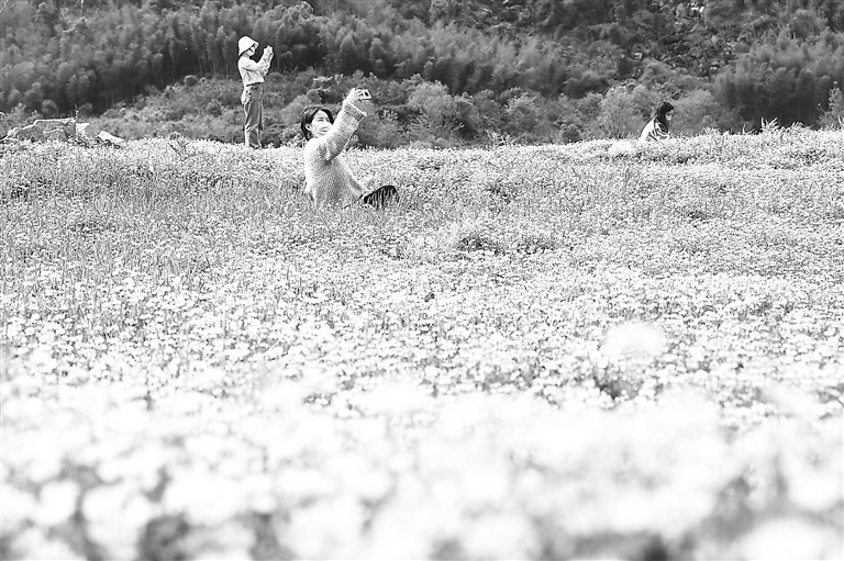 3月29日,在南昌市湾里管理局梅岭狮子峰景区,游客正在赏紫云英花。在严格落实疫情防控措施的前提下,该管理局部分景区正有序恢复开放。