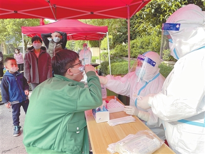3月29日,在南昌市西湖区万科金域蓝湾小区,志愿者引导居民有序接受核酸检测采样。