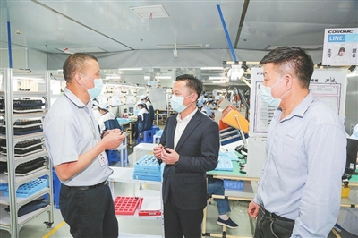 上栗县实行跟踪服务机制,坚持县分管领导带头服务、挂点乡镇(工业园)全力服务的安商服务机制,实施“五个一”跟踪服务机制,协调解决企业落户、建设、投产等全周期出现的问题。图为上栗县桐木镇党委班子上门协助佳禾电声解决招工难问题。 何 凯摄