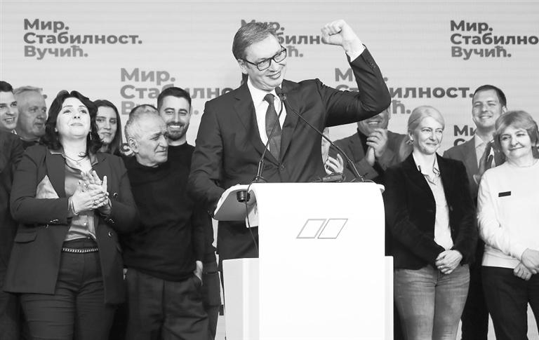 4月3日,塞尔维亚总统武契奇在位于首都贝尔格莱德的塞尔维亚前进党总部讲话。武契奇3日晚宣布,根据塞尔维亚前进党的初步统计结果,他在当天早些时候举行的总统选举中赢得连任。新华社发 (普雷德拉格·米洛萨夫列维奇摄)