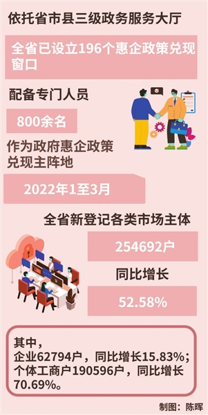 持续优化营商环境,激发市场主体活力。今年1至3月,全省新登记各类市场主体254692户,同比增长52.58%。其中,企业62794户,同比增长15.83%;个体工商户190596户,同比增长70.69%。