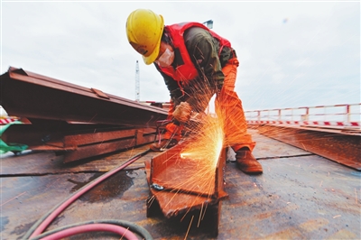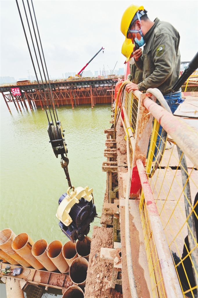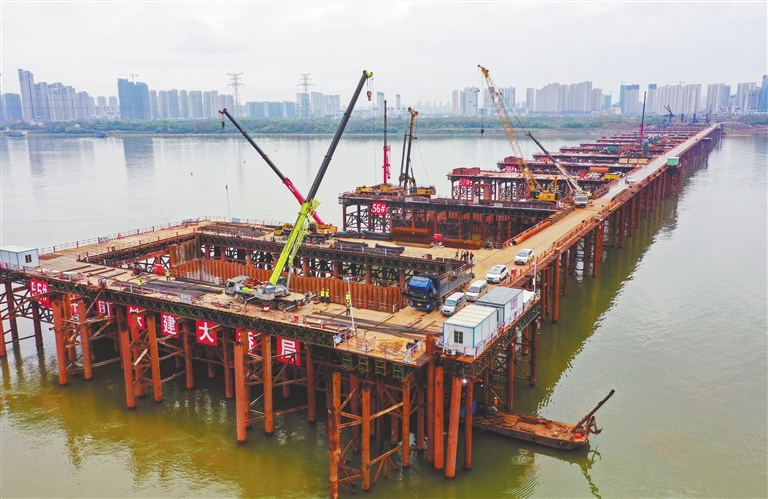 3月29日,南昌市九龙湖过江大桥项目建设现场机器轰鸣,重型车辆来往穿梭,中国铁建大桥局的工人们在各自岗位上紧张有序地忙碌着。