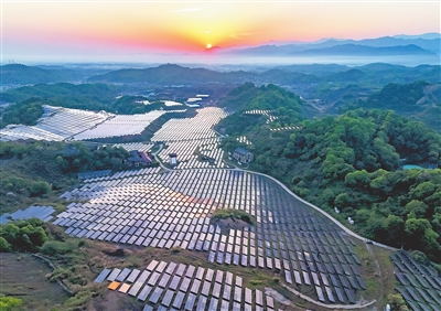 4月9日,被7.3万块太阳能电池板覆盖的原高坑煤矿区,在晨曦映照下,闪耀着迷人的金光。近年来,萍乡市安源区高坑镇坚持走生态优先、绿色发展之路,对工矿废弃地进行种树补绿,还引资“种”下500多亩光伏,修复了废弃矿区生态,产生了可观的社会效益、生态效益和经济效益。