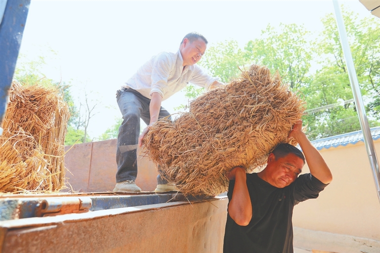 4月7日,在抚州市东乡区杨桥殿镇宋塘村东海水库旁,村干部正在搬卸草绳。进入汛期,该区加强水利设施检查,对各类抢险物资和应急设备进行补充,扎实做好各项防汛备汛工作,确保安全度汛。特约通讯员 饶方其摄