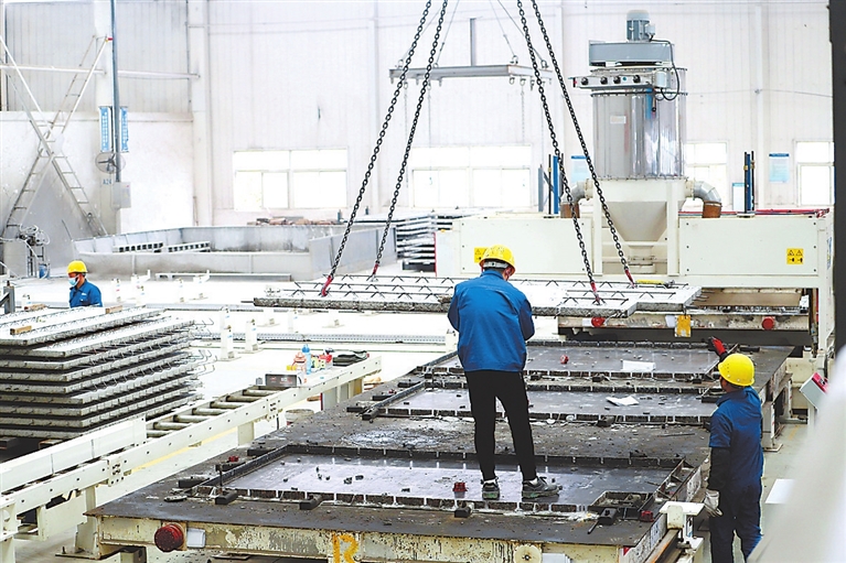 得益于新工艺,装配式结构施工把传统建造方式中大量的现场作业转移到工厂进行,经过加工的预制叠合楼板、空调板、楼梯、蒸压轻质混凝土墙板等构件运至现场装配。记者看到,在工厂的钢筋网片生产线上,自动化钢筋绑扎代替了手工绑扎,两名工人娴熟地操作焊网机、钢筋弯箍机等机械设备,一片约3平方米的钢筋网片绑扎成型仅用时2分钟,不仅效率高,还有效减少了钢筋损耗。同时,混凝土预制构件从布料、浇筑到养护成型,也全部在生产线上完成。