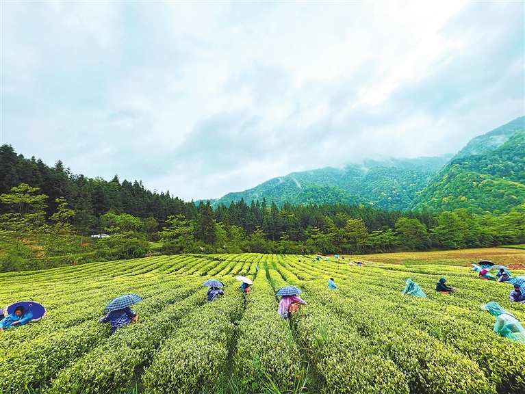 4月15日,细雨绵绵。修水县黄沙镇抱云茶叶基地内,茶林翠绿、远山青黛、云雾缭绕,茶农们正忙着采春茶。好一幅春意盎然的生态画卷。