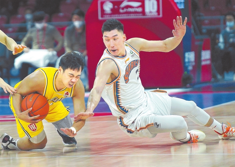 4月17日,上海久事队球员可兰白克(右)与浙江广厦控股队球员许可在比赛中争抢。当日,在江西南昌举行的2021-2022赛季中国男子篮球职业联赛(CBA)季后赛半决赛中,广厦队以103:100战胜上海队,大比分3:0晋级总决赛迎战辽宁队。新华社记者 万 象摄