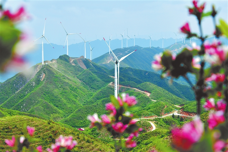 4月20日,兴国县茶园乡十八排风电场风力发电机矗立在群山之中,与绽放的红杜鹃相映成趣。近年来,兴国县大力发展风力发电等绿色经济产业,实现生态保护和可持续发展,助力碳达峰碳中和。 特约通讯员 陈 鹏摄