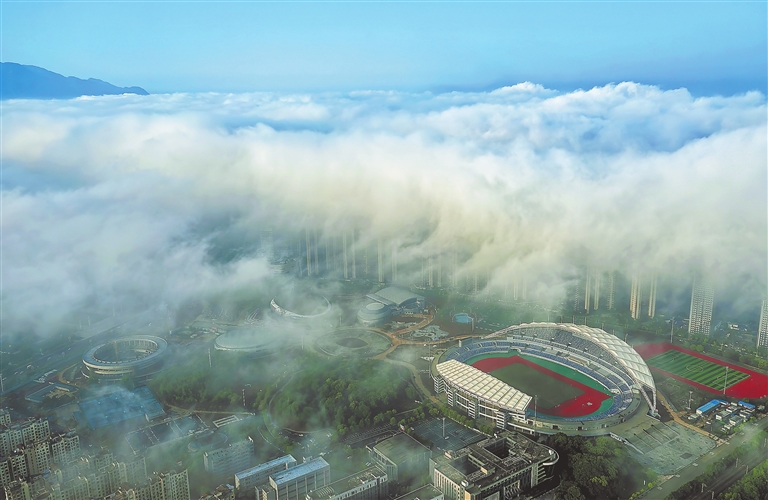 4月21日,云雾下的九江市体育中心显得十分美丽。江西省第十六届体育运动会将于10月在九江举办,届时,开幕式和部分赛事将在九江市体育中心主体育场举行。目前,场馆建设和升级改造工作正有序进行。本报记者 燕 平摄