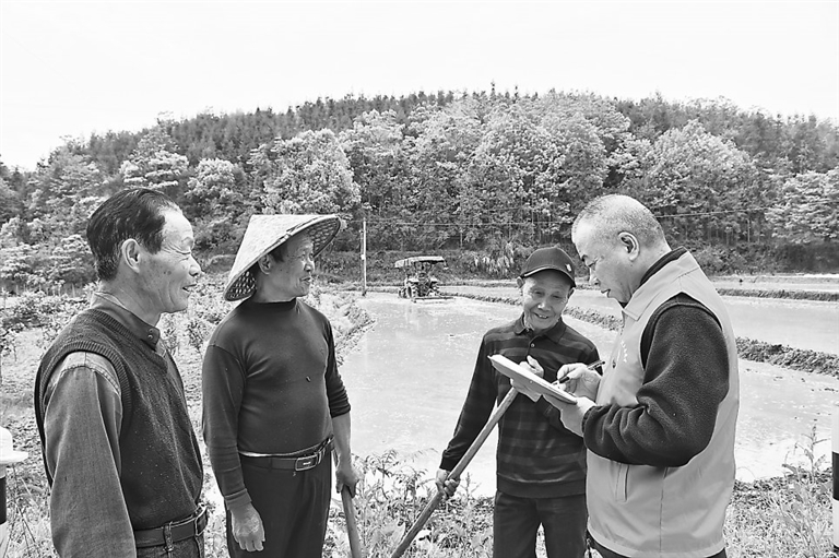 5月1日,宜春市袁州区渥江镇干部在田间地头了解春耕情况。今年以来,该镇组织100余名党员干部、人民信访调解员进村入户,开展“党建+民情工作日记”活动,打造有“温度”的人民信访工作。 通讯员 易金禹摄