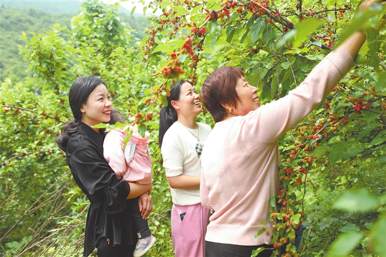 近日,莲花县六市乡山背村桑葚采摘园迎来丰收,紫红的桑葚挂满枝头,吸引众多游客前来采摘。该村通过游客采摘,网络销售桑葚干、桑葚酒等,村级集体经济至少增收5万元,惠及39户脱贫户。钟进文摄