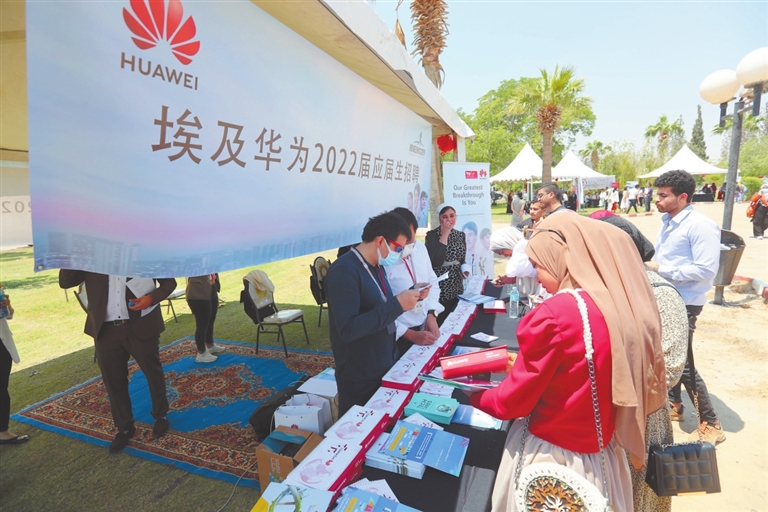 5月17日,在埃及伊斯梅利亚,埃及学生在华为埃及公司招聘展位询问信息。