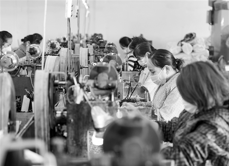 ▲5月16日,万年县梓埠镇后张村村民在家门口的就业帮扶车间,加工出口欧美的晴雨伞。连日来,万年县及时解决企业遇到的实际困难和问题,帮助就业帮扶车间加快生产。 特约通讯员 徐声高摄