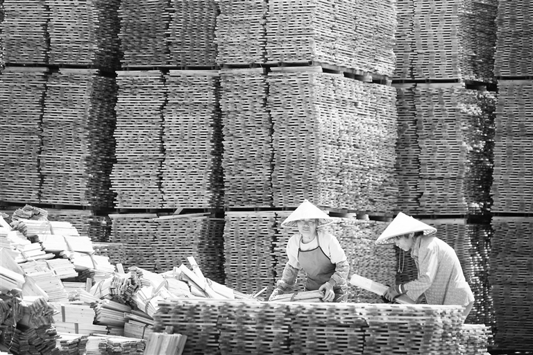 ▶近日,上高县锦江镇永丰木业有限公司存储处,农户正在码架木材,便于木材晾干。近年来,该镇探索“企业+车间+农户”的帮扶新路径,让农户在家门口实现就业。 特约通讯员 陈旗海摄