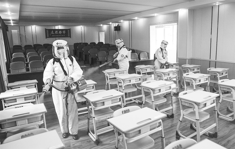 5月21日,在南昌市东湖小学,省红十字水上救援队防疫消洗处置大队队员对学校教室、走廊、操场等场所进行全面消杀作业,营造安全卫生的校园环境,迎接师生返校复课。史港泽摄