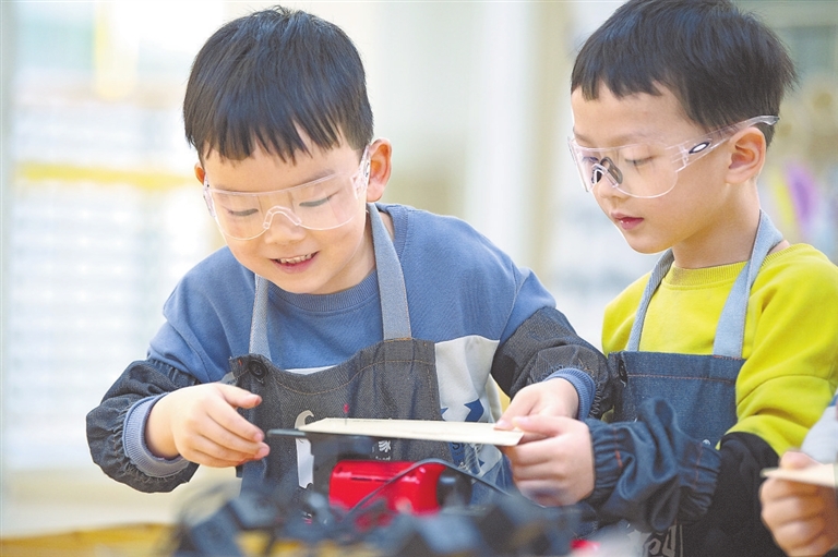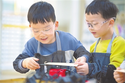 5月18日,新余市蓓蕾幼儿园木工劳动实践主题课上,孩子们正在搭建建筑模型。新余市各中小学校、幼儿园通过多样化劳动实践课程,培养学生热爱劳动的品质。 特约通讯员 赵春亮摄