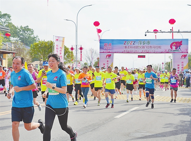 5月21日,2022年萍乡市第二届“重走秋收起义路”红色马拉松赛在“红色名村”芦溪县山口岩村鸣枪起跑,终点设在同为“红色名村”的莲花县高滩村。1000余名运动爱好者在奔跑中重温红色历史,享受运动快乐。钟进文摄