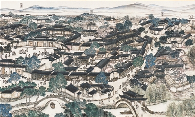 长卷以山水画与风俗画相结合的方式,顺序描绘历史上鼎盛时期景德镇及其所产瓷器运往广州、外销至欧洲的全过程。绘画以写实性描绘为主,工细的白描敷以淡彩和皴染,细节清晰、翔实而又丰富生动。在第一部分长卷中,作者将景德镇瓷器生产的72道工序与风情民俗、周边自然环境融为一体,画中各色人物虽仅高约1厘米,但不仅身份与体态特征鲜明生动,还线条细劲流畅,体现了画家扎实的人物画功力。长卷中更令人钦佩的,是画家借助中国山水画“三远”之法,通过视角高低变化和远近调节,创造性地将大跨度的山川、城镇、街道、人物及生产、生活场景巧妙衔接再现于一图,体现了作者对宏大绘画主题的整体把握能力与匠心。