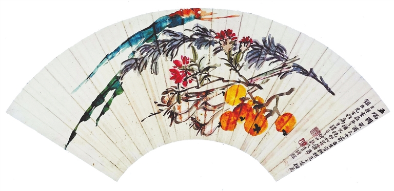 这幅扇面画为小写意墨彩中国画,设色淡雅,金黄的枇杷成为画的“主角”,格外抢眼。五物的安排颇有讲究:枇杷置于前右下方,紧接着是两个大蒜头和一枝石榴花,最后面是一枝艾草和3根菖蒲叶;菖蒲、艾草、枇杷、石榴花四物头尾方向一致,为了使画面平衡,视觉感较重的两个大蒜,头尾方向与四物相反,五物穿插,成为一个和谐的整体;高纯度的枇杷、红艳的石榴花和花青色菖蒲,与淡墨色的大蒜、艾草形成彩墨和浓淡的对比,层次感强。此外,石榴花与落款处的两枚红色印章也形成色彩的呼应。在整幅章法上,主体“五瑞”置于扇面中间位置,右边3行落款字紧密,墨色较重,与扇面左边大片留白形成疏密对比,体现“疏可走马、密不透风”的美学原理。