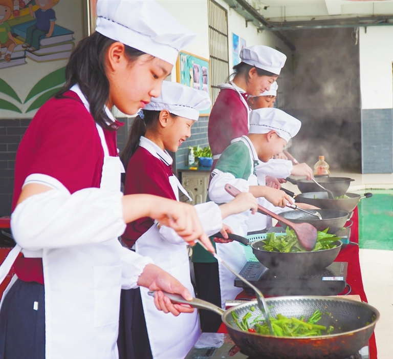 5月31日,南昌市八一嘉实希望小学开展校园厨艺比拼大赛,同学们采摘学校菜地的新鲜蔬菜进行烹饪,享受劳动的快乐。蔡铖歌摄