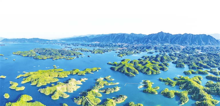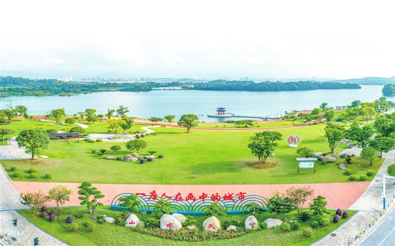雨后的北湾半岛,湖光潋滟、山色空蒙、白鹭翩跹。樱花、山茶新叶在阳光照耀下熠熠生辉,韩花梨结出一个个青翠小果,千亩莲花、紫薇含苞待放,处处显现出蓬勃生机。