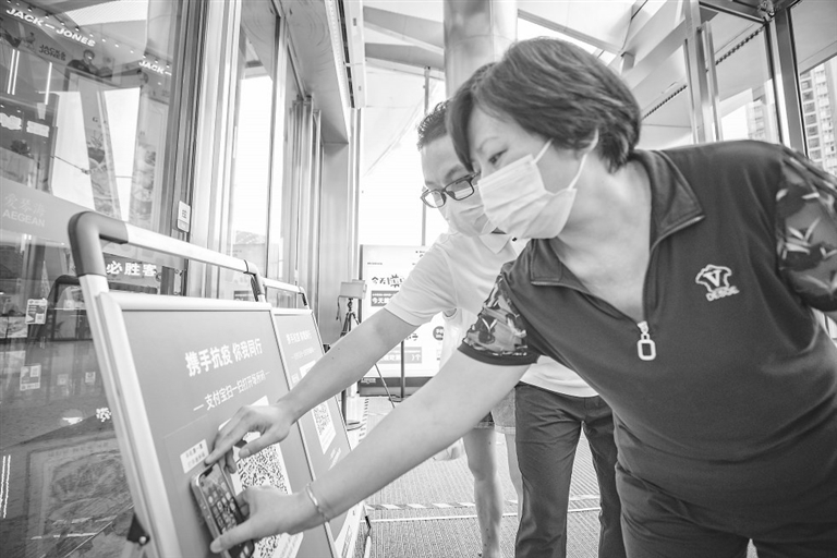 7月4日,在重庆两江新区一购物公园内,工作人员(左)引导顾客使用NFC功能完成入场登记。当日,NFC防疫登记功能在重庆试点上线。用户只需将开启NFC功能的手机,亮屏靠近场所码线圈,手机自动读取NFC标签,快速唤起场所码/健康码页面后,完成快速展码。该功能通过“贴一贴”完成登记,提高了疫情防控登记、展码的效率。新华社记者 黄 伟摄