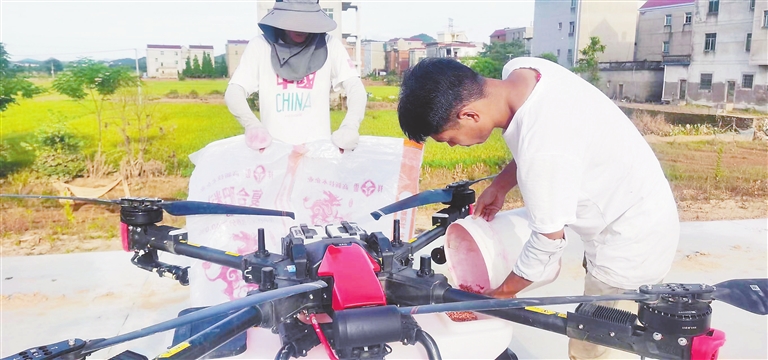 在南畈村委会方家滩小组,数台大型旋耕机来回在田里穿梭。田头,程秀清和她的生产自救小分队,熟练地操控机器,无人机腾空而起,带着满满一筐稻种,按照事先输入的位置对大田播种,仅3天时间,400亩水田播满了冒出新芽的稻种。