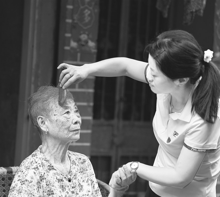 7月6日,南昌市西湖区社会保险事业服务中心干部来到广润门广二区独居老人熊大润家开展志愿活动,他们帮老人打扫卫生,安装电风扇,并悉心为老人梳头。 通讯员 刘克钿摄
