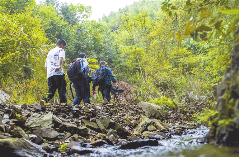 六月的一场暴雨过后,记者来到赣湘交界、风光旖旎的修源尖,沿金沙河溯河而上探访修河源。经过暴雨冲刷,两山之间的小路上乱石横斜,但是小溪流却清澈见底,蜿蜒而下。峡谷中峭壁峥嵘,山林茂密,上庄村党支部书记林坚拿着砍刀在前砍去杂草乱枝,带领我们从曾家洞谷底向上穿行。途中茂林修竹,杂花生树,淡香浮动,偶见珍贵的南方红豆杉、伯乐树;溪流叮咚,遇落差便成小瀑布,飞玉溅珠;鸟叫蝉鸣,山林里好不热闹。林坚介绍,小溪里还常有娃娃鱼、棘胸蛙栖息繁殖。行进1个多小时,我们见到了修河源的石碑,石碑两侧,两股泉水从石缝中汩汩而出,涓涓细流顺着谷底源源不绝,汇成一溪,一路向前。
