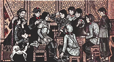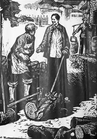 革命需要接力,精神需要传承。当年的赣南画家们,没有忽视儿童题材的挖掘。陈一文的国画《革命代代如潮涌》,通过老师和老红军带领学生去看电影《闪闪的红星》的情景,寓意革命精神代代传。刘世群入选1975年全国年画展的《饮水思源》(合作),描绘的是一群小学生在瑞金沙洲坝红井旁听老人讲毛主席挖井的故事,表现了“红井甘露育万代,代代永做革命人”这一主题。《阅读》是罗会年、张智勇合作的黑白木刻,放学后的6名儿童,正聚精会神地阅读《雷锋》《张海迪》等图书,表现了少年一代学英雄、学楷模的风尚。