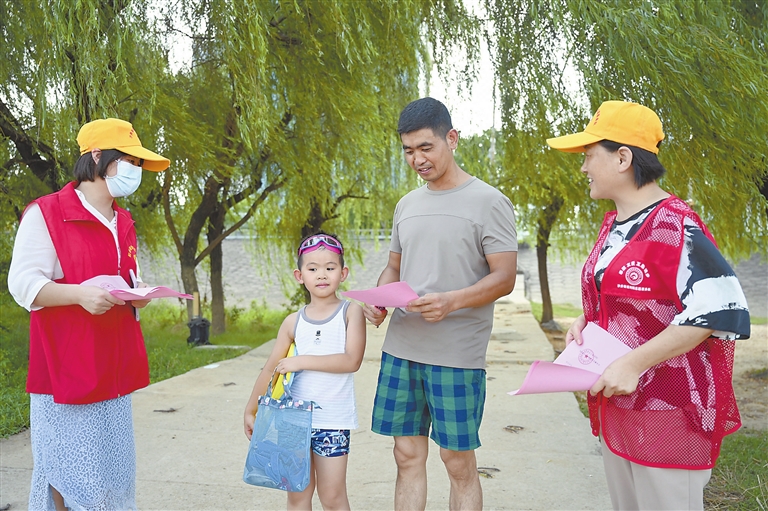 7月13日,在南昌秋水广场,红谷滩区沙井街道巾帼志愿服务队和南昌蓝豹救援队志愿者们一道,开展联防联控巡查和防溺水宣传。图为志愿者为群众发放防溺水安全知识传单。 本报记者 李 劼摄