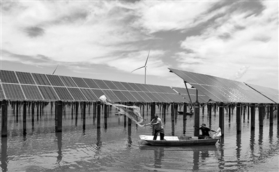 该光伏电站总装机容量80兆瓦,建设在约3000亩的鱼塘上,让鱼塘形成了“水上发电、水下养鱼”的绿色生态养殖模式,极大提高单位面积土地的经济价值。每年还以土地流转的方式让村民增收,进一步助力乡村振兴。新华社记者 孙凡越摄