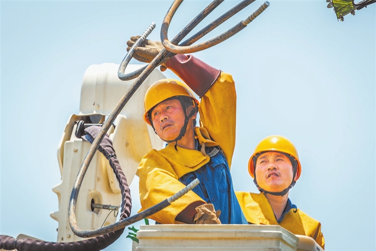 近日,国网江西鹰潭供电公司电力检修工人冒着酷暑,对余江区潢溪镇循环经济园相关线路更换真空开关,确保为27家企业和1241户村民不间断供电。通讯员 万智辉摄