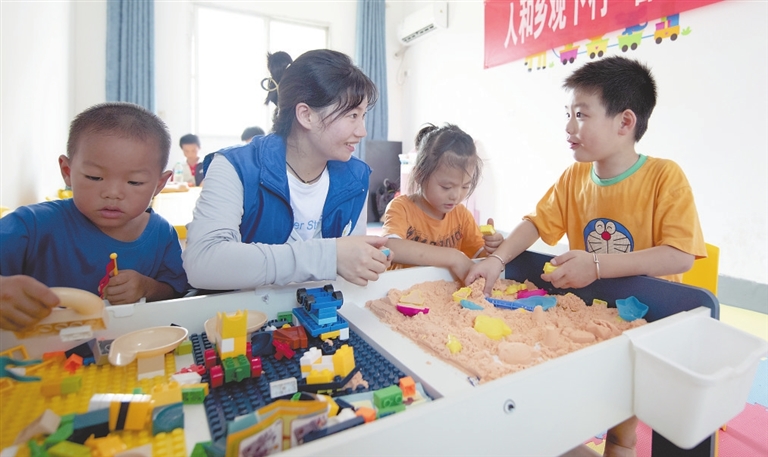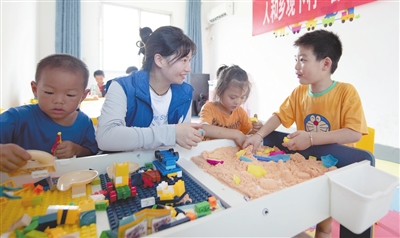 8月3日,在新余市渝水区人和乡观下村童心港湾活动中心,由返乡大学生、乡镇和村委干部组成的志愿者正陪伴孩子们开展趣味运动。新余市组织志愿者对乡村青少年、幼儿开展暑期趣味运动、劳动实践、情感陪伴、公益托管和夏令营等丰富多彩的主题活动,让孩子们度过快乐暑假。 特约通讯员 赵春亮摄