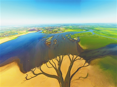 8月21日,航拍水位下降的鄱阳湖进贤段水域,滩涂裸露,呈现出大树形状的自然景观,充分展现了大自然的鬼斧神工。本报记者 李 劼摄