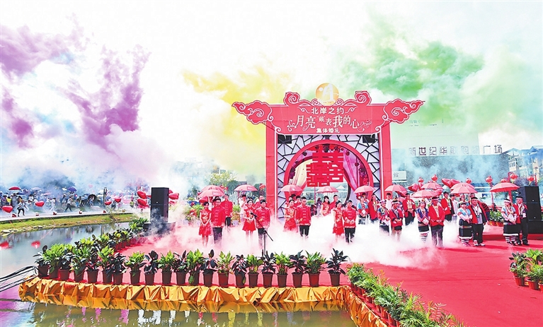 以月为媒,将月老文化和月亮文化深度融合,包含相亲大会,放河灯许愿,观看焰火晚会、非遗表演,体验客家婚礼习俗、猜灯谜等系列活动。