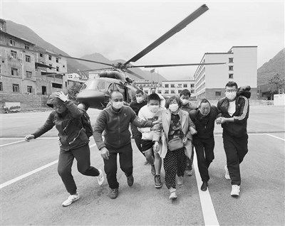 9月7日,首批从海螺沟搭乘直升机疏散出来的滞留人员抵达泸定县磨西镇。当日,从四川省海螺沟景区疏散的200余名当地群众、游客和工作人员等搭乘直升机抵达四川省甘孜州泸定县磨西镇。