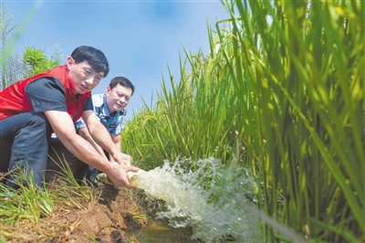 9月2日,庐山市人民法院的党员志愿者为温泉镇隘口村捐赠水泵,协助村民把水送到稻田当中。特约通讯员 韩俊烜摄