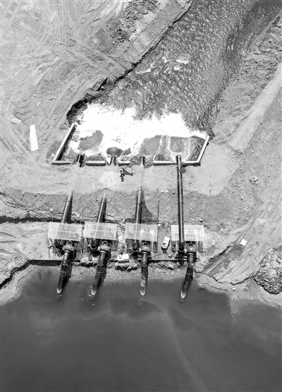 9月9日,万年县境内鄱阳湖支流乐安河梓埠段,4台水泵正在抽水抗旱。针对日趋严峻的旱情,该县紧急投入110万元,在乐安河梓埠段的河中央位置,临时建设一座440千瓦大型提灌站,抽乐安河水到玉津河,解决了10万亩农田用水需求。特约通讯员 徐声高摄