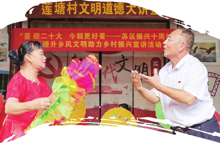 “树立文明新风貌,孝老爱亲成榜样;婚事简办成新潮,兴盛秀美是渡江……”连日来,渡江镇组织民间艺术队伍以三句半、快板等文艺表演形式,走近群众身边开展文明新风宣传。聚焦打通宣传群众、教育群众、关心群众、服务群众的“最后一公里”。渡江镇按照“全域覆盖、标准建设、特色打造”的思路,整合资源按“一村一站,一站一品牌”目标打造了1个文明实践所、6个文明实践站。